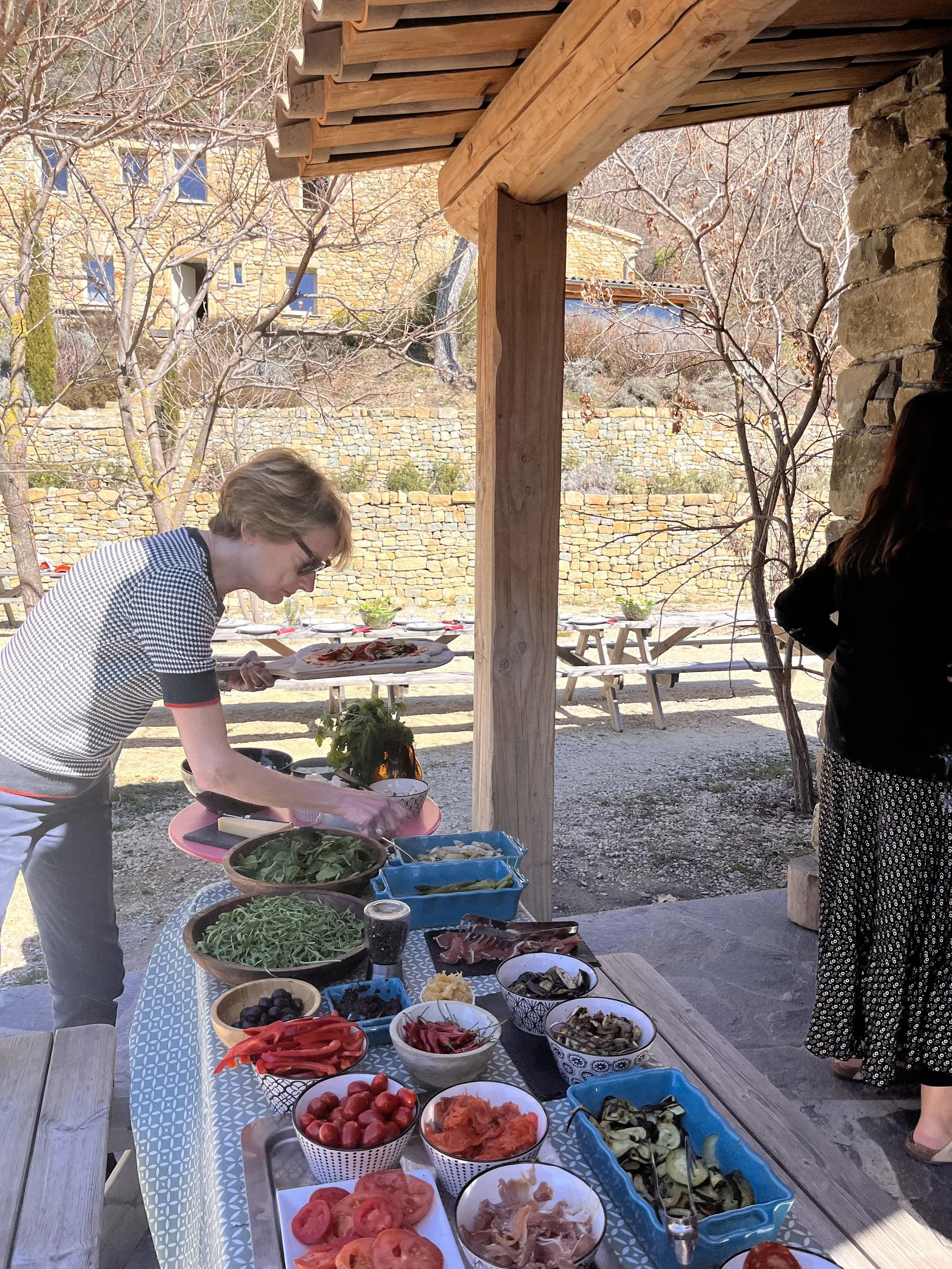 Pizzas préparées en binômes : base tomate ou crème, légumes grillés, mozzarella, herbes de Provence